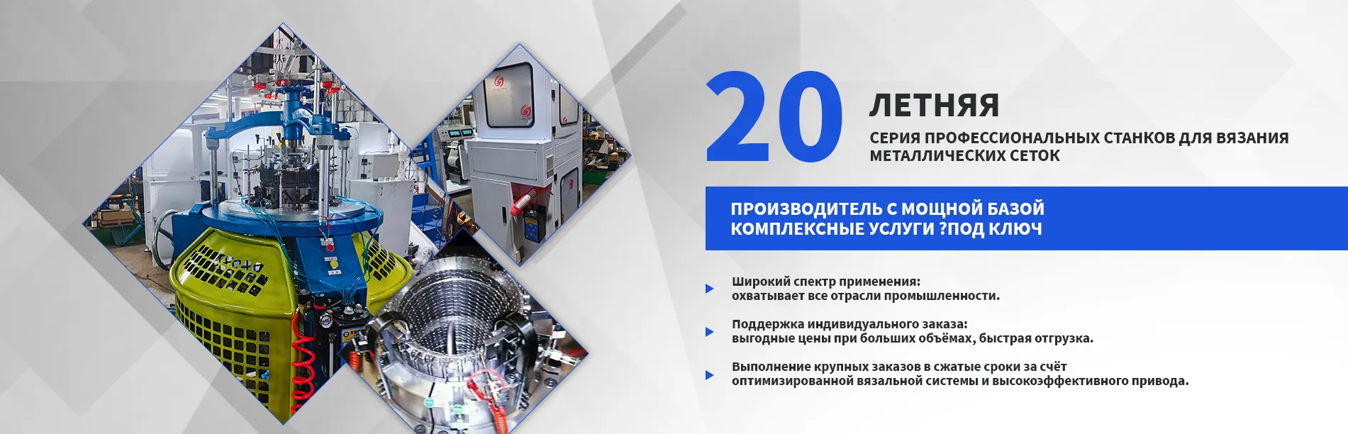 Наша компания производит трикотажные машины для фильтрующей сетки газ-жидкость. Технология является передовой, уровень автоматизации — высокий. Данное оборудование предназначено для вязания нержавеющих стальных проволок марок 304, 302, 301, 316L.